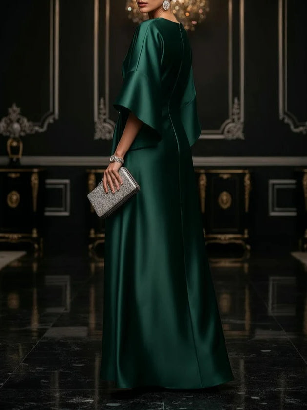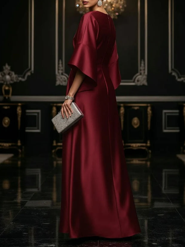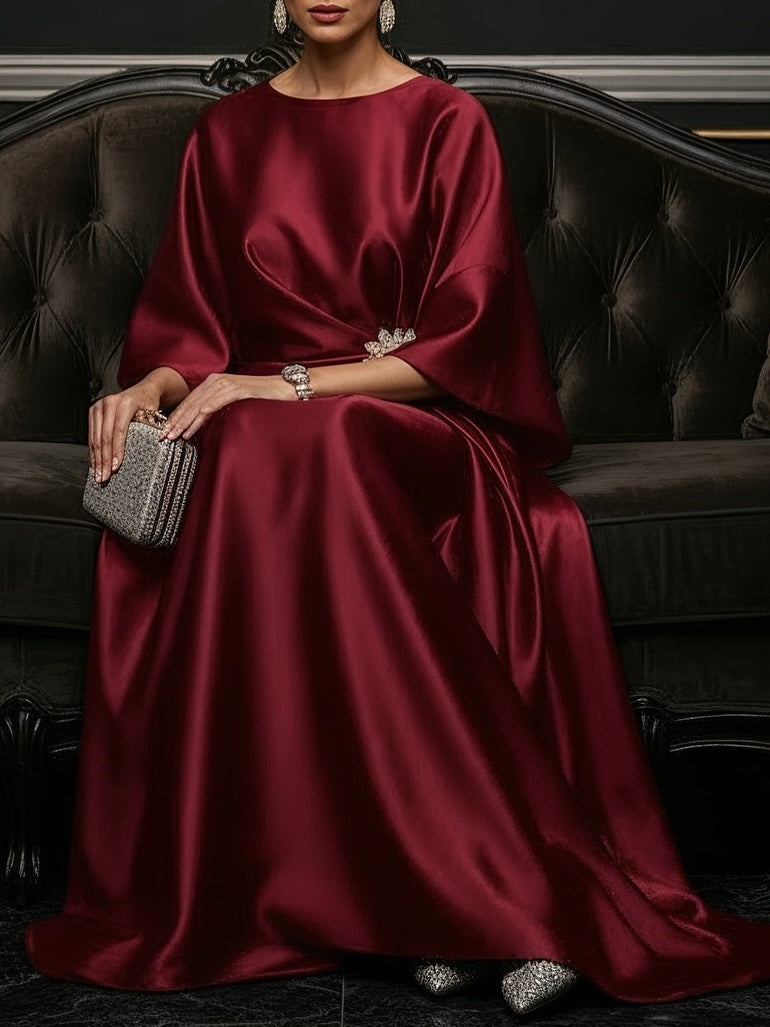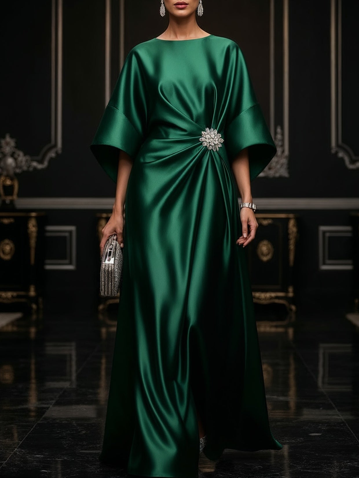 Crafted from luxurious satin, this piece drapes beautifully and flows gracefully around the silhouette. Voluminous sleeves add a touch of modern drama, while a dazzling crystal brooch at the waist adds a touch of sophistication and elegance. Perfect for an evening under the chandeliers or an intimate soiree.