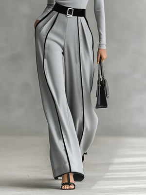 White Trim High-neck Long-sleeved Top With Wide-leg Pants and Belt Set