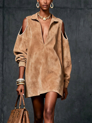 Design: Featuring a trendy camel hue, this dress boasts a chic cold-shoulder design and a deep V-neckline, giving it a modern and stylish edge. The open shoulder detail adds a hint of allure and uniqueness.