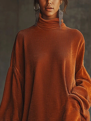 Orange corduroy loose tassel hem high collar dress