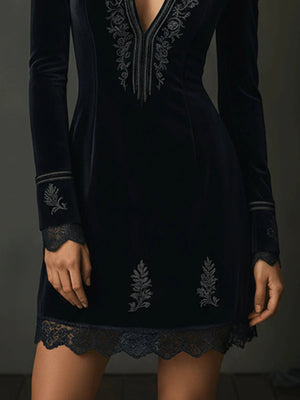 Retro Black Velvet Embroidered Lace Trim Mini Dress