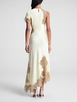 Our Dress is bias-cut, asymmetrical silhouette skims the body, featuring beige eyelash lace paneling throughout and a back keyhole with a hook-and-eye closure.