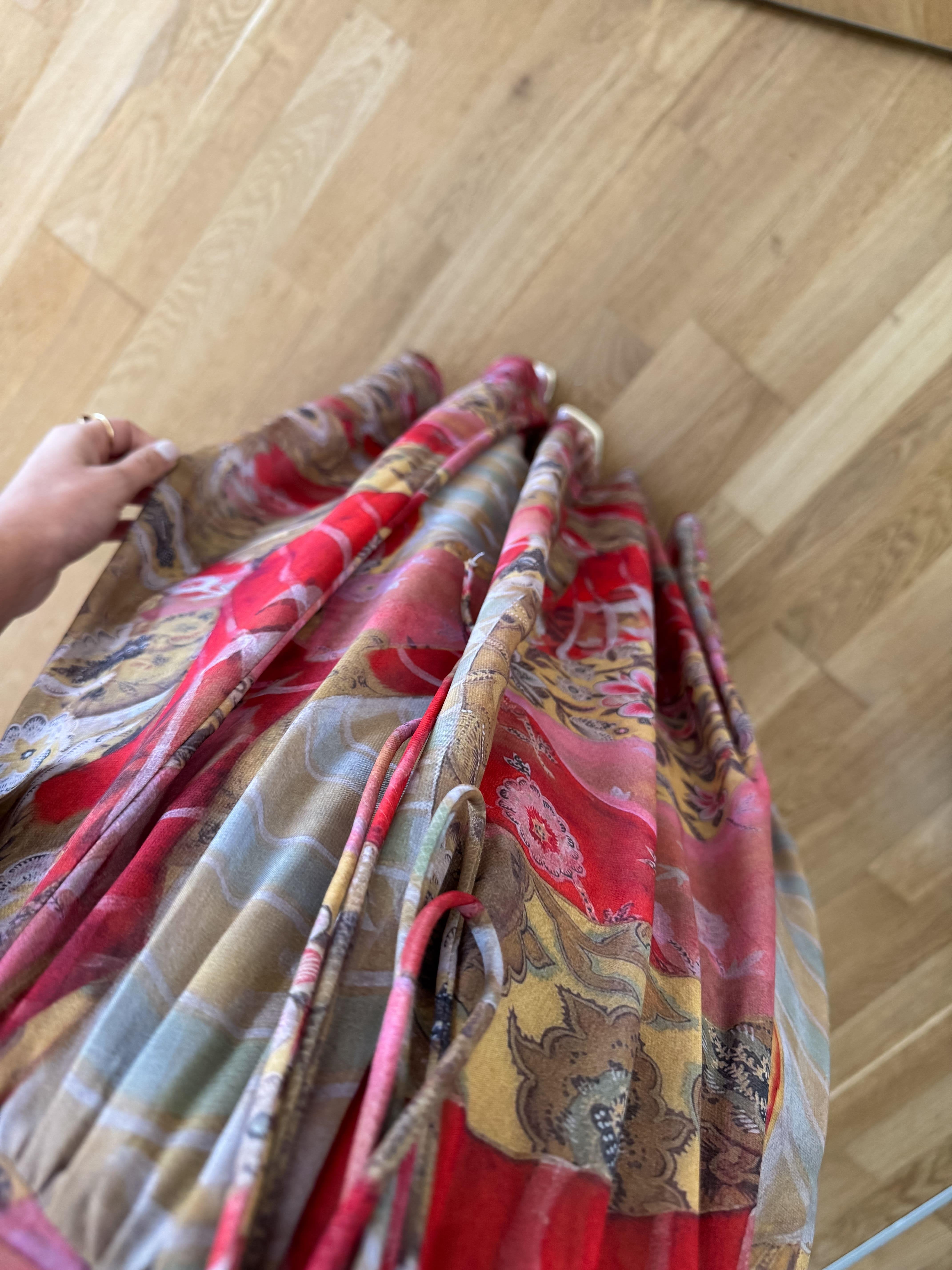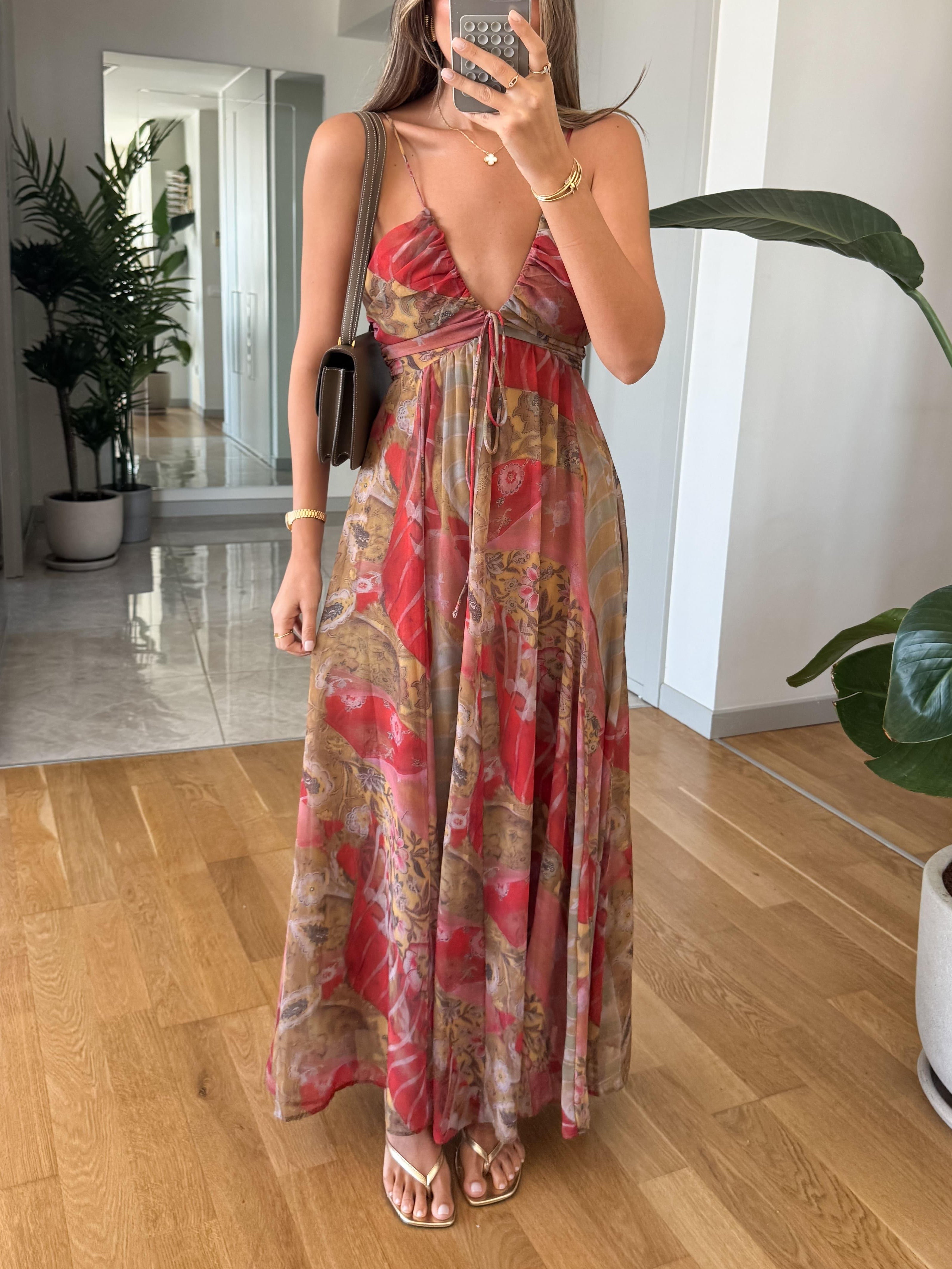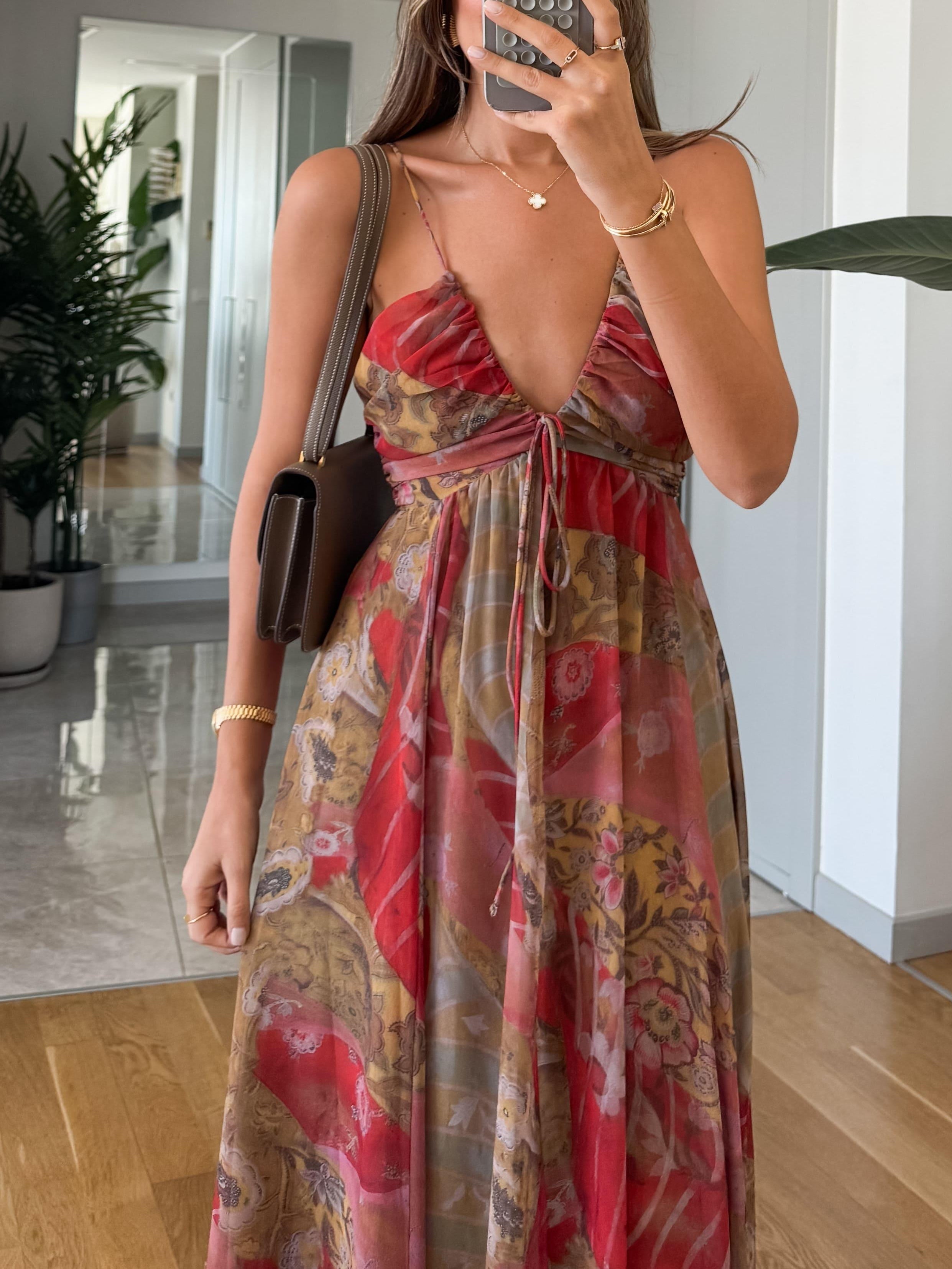 Strapless Deep V Patterned Printed Chiffon Maxi Dress