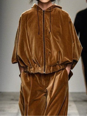 Brown velvet zip-up hooded sweatshirt and trousers set