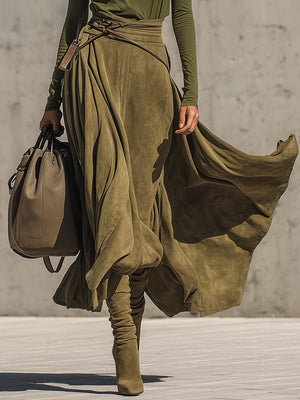 Design: The olive green ensemble pairs a fitted turtleneck with a high-waisted faux suede maxi skirt featuring wrap-style draping and tie detailing at the waist.