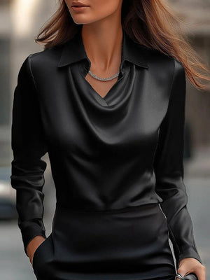 Solid Satin Floral Print Simple Swing Collar Shirt Top