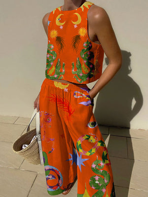 Paired with the tank top is a pair of elastic waist pants adorned with the same unique print. These pants offer a comfortable and flattering fit, thanks to their elastic waistband and wide-leg silhouette. Plus, with convenient pockets, they're as practical as they are stylish, allowing you to carry your essentials with ease.