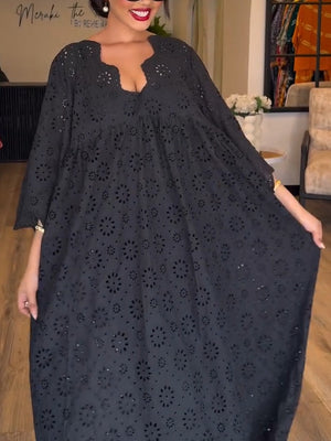 This dress has a loose and large silhouette, a deep V neckline and wavy edges, adding sexiness and softness. The delicate round hollow pattern makes the solid color dress not monotonous, enhances the exquisiteness of the details, and has slightly flared three-quarter flared sleeves.