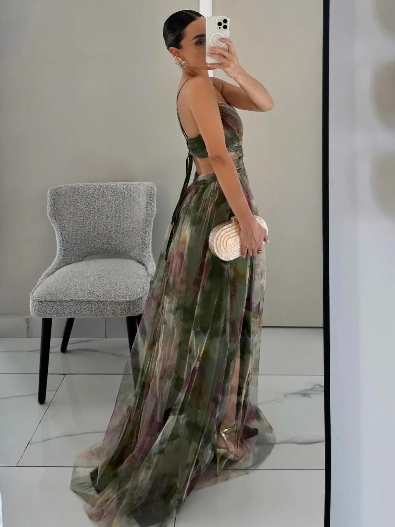 Elegant Painted Floral Print V-Neck A-Line Maxi Dress