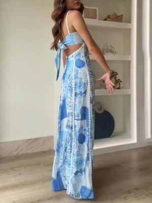 Be stylish and comfortable in our unique lace patchwork printed back tie halter flare long dress.