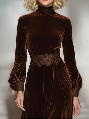 Lace Patchwork Turtleneck Balloon Sleeve Velvet Maxi Dresses