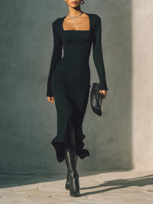 A sleek and form-fitting black maxi dress made from stretch blend fabric, perfect for a minimalist and sophisticated look.