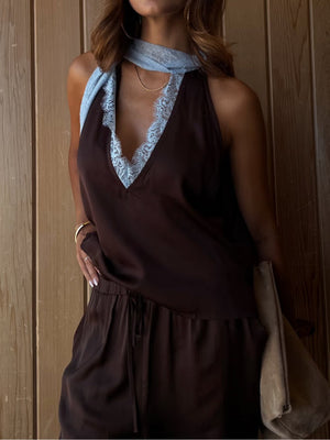 Chic Brown and Blue Lace Panel Top