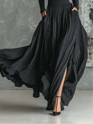 Elevate your style with the Women's Fashion All Black Skinny Turtleneck T-shirt and Pleated Skirt Set. This chic ensemble combines a sleek turtleneck with a stylish pleated skirt, perfect for creating a sophisticated yet trendy look.