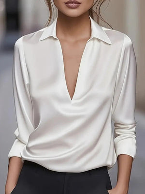 Solid Color Satin V-neck Long-sleeved Casual Shirt