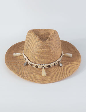 The hat is beautifully adorned with shell tassels, adding a touch of coastal charm and bohemian flair. The delicate shells create a unique and eye-catching detail that sets this hat apart.